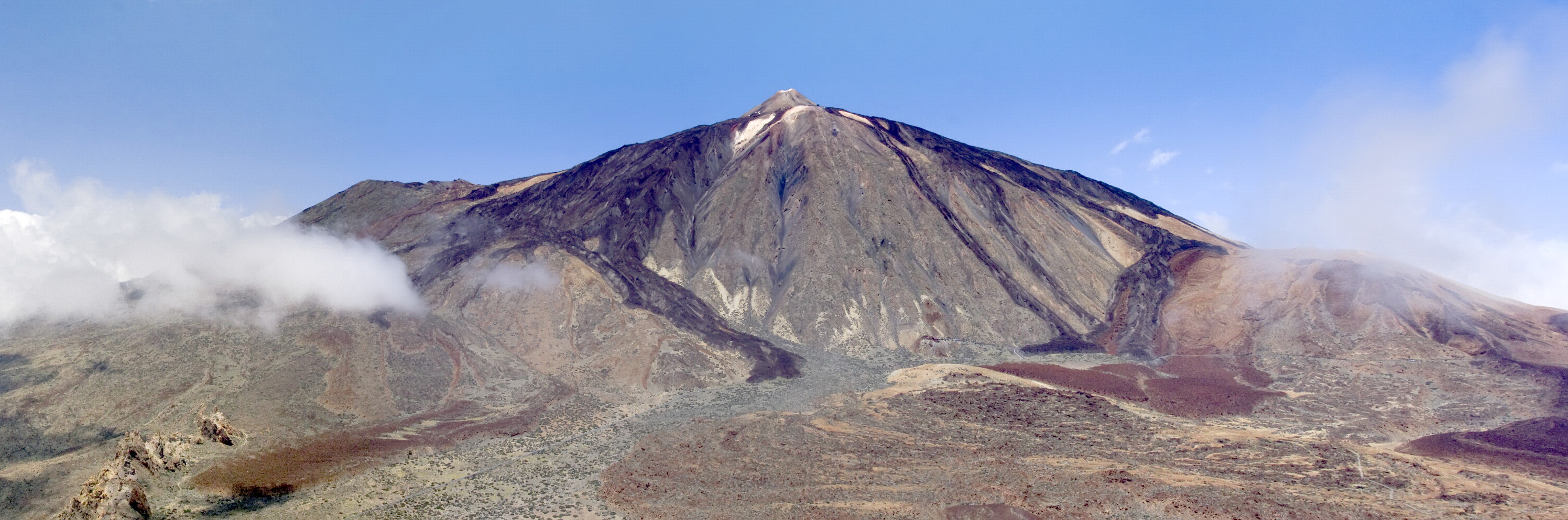 Links im Foto sind noch Teile der Los Roques zu sehen, an der westlichen Flanke des Teide, links, der Pico Viejo, der alte Berg, der, mit dem das Inselleben begonnen haben soll. Die rechte Flanke des weißen Berges ist der Montana Blanca, der bei schönem Wetter ebenfalls eine grandiose Sicht bietet, nämlich Richtung Norden, Sonnenobservatorium, Montana Fortaleza, und in die Caldera rein bis ziemlich weit gen Westen. Den teide selber sieht man von da eher schlecht. Über die rechte Flanke führt auch der Aufstieg zu Fuß, den geübte und fitte Kletterer wohl in 5 bis 6 Stunden bewältigen, Flitzer auch in 3.
