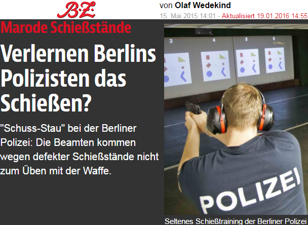 In Berlin sind die Schießstände der Polizei z.B. dermaßen marode, daß eine reguläre und somit zielführende Ausbildung im Grunde nicht mehr stattfindet. Berliner Polizisten ziehen sich das, was sie für ihre tägliche Schießpraxis brauchen, aus dem sonntäglichen Tatort mit Til Schweiger.
