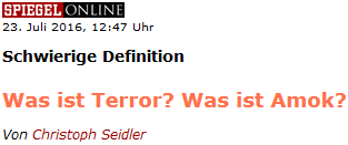 Die Propagandafaschisten des Spiegel lenken vom wesentlichen Sachverhalt ab, daß sie selber Terroristen sind. Es ist überhaupt keine schwierige Definition. Siehe oben. Der Anschlag zu München war ein Terroranschlag, denn er sah wie einer aus, hatte die Wirkung eines Terroranschlags und wurde von den zuständigen Organen einschließlich der Bundesregierung so behandelt. Da gibt es kein zurück. Motive sind ausschließlich für den Gerichtspsychiater und dumme Schriftsteller der Lügenpresse von Bedeutung. Das ändert am Geschehen null, nado, nix.